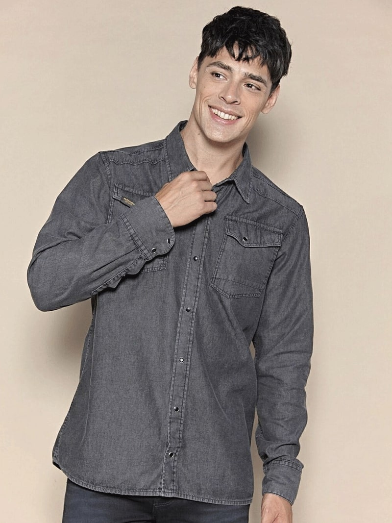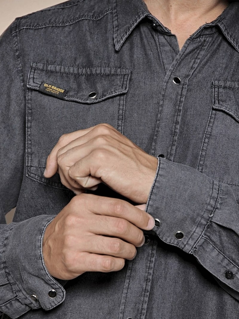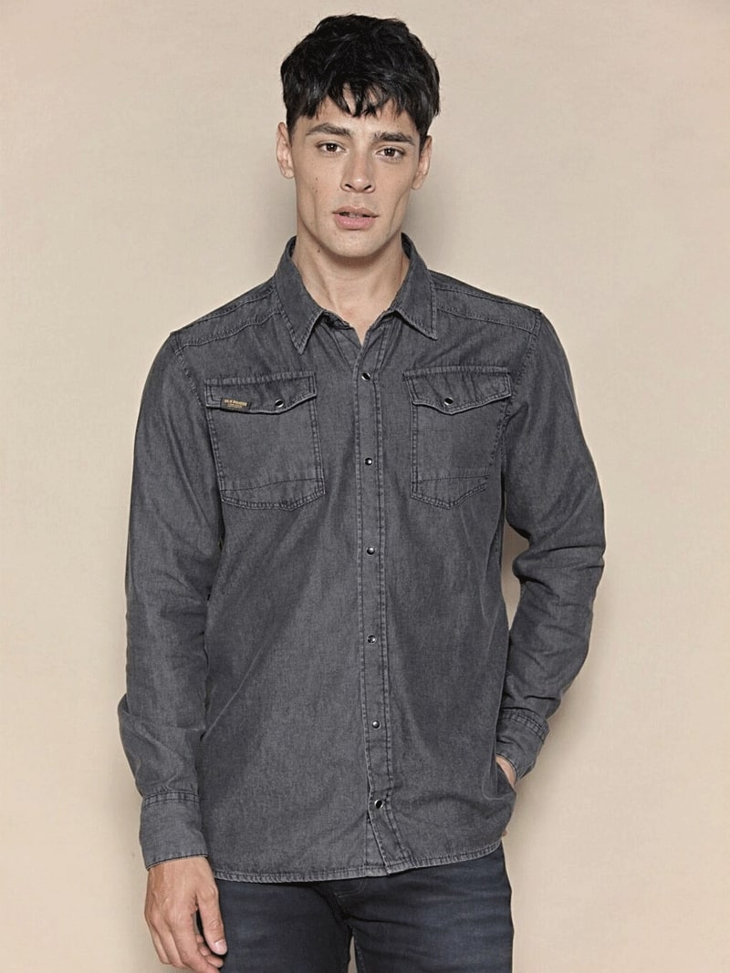 Camisa de denim liviano, de color negro con localizados suaves, es de puro algodón, mangas largas, y calce regular. Tiene cartera con broches, y canesú en espalda y delantero. Cuenta con bolsillos plaque con diseño diagonal.