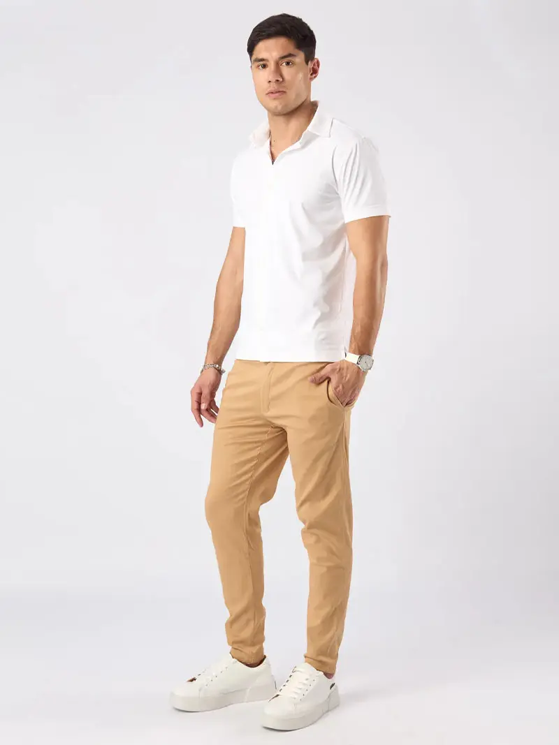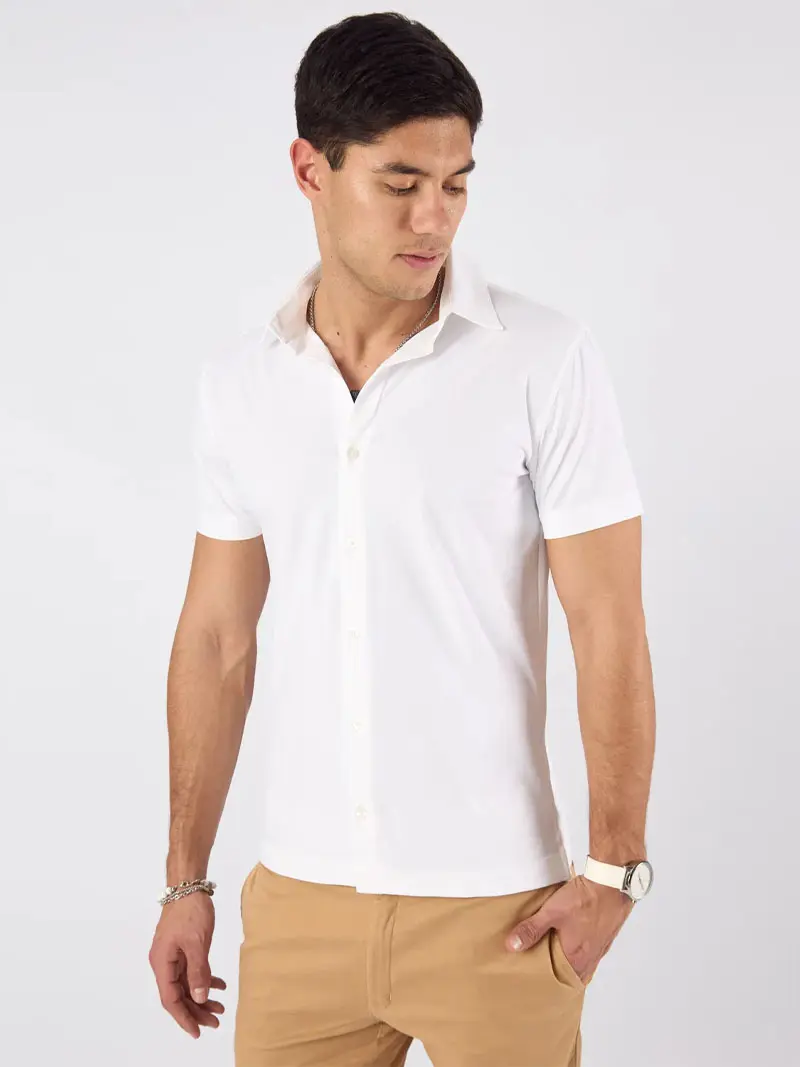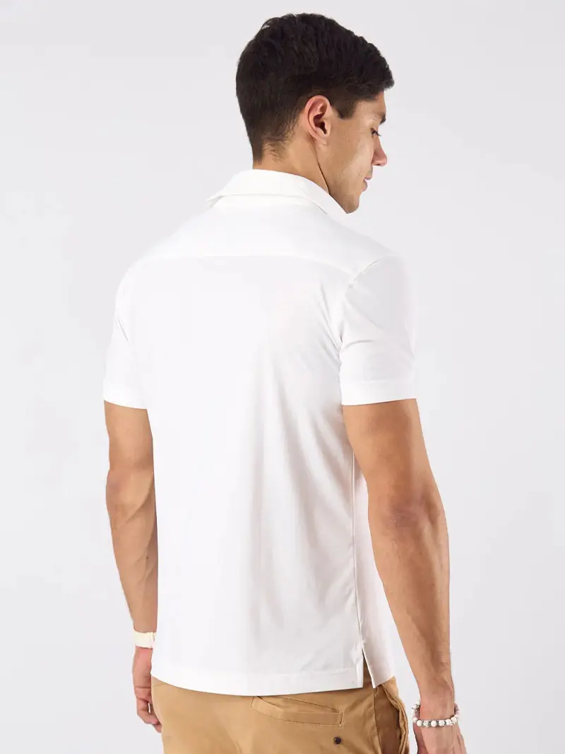 Camisa manga corta slimfit confeccionada en lycra de seda, este tejido stretch presenta una gran elasticidad y confort. Detalle de grifa textil en interior de cartera de acceso.