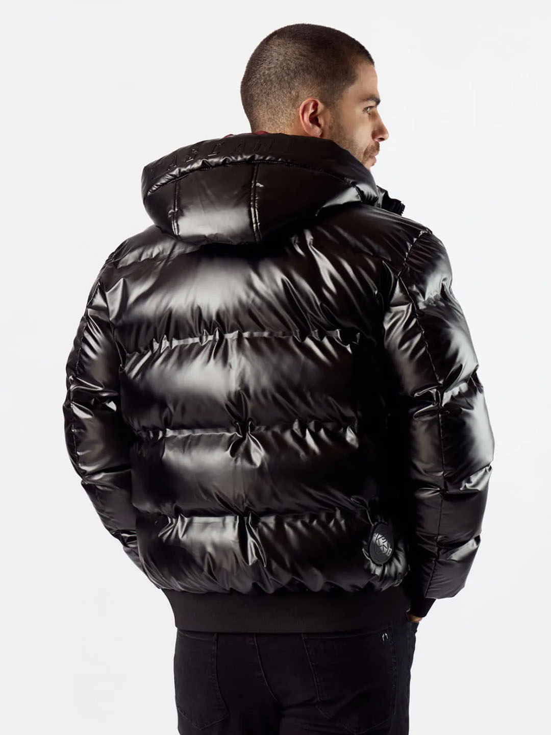 Campera clasica de abrigo en textil satinado opaco con paneles anchos acolchados termosellados, generados mediante costuras de calor, que definen el matelaseado sin necesidad de pespuntes tradicionales.