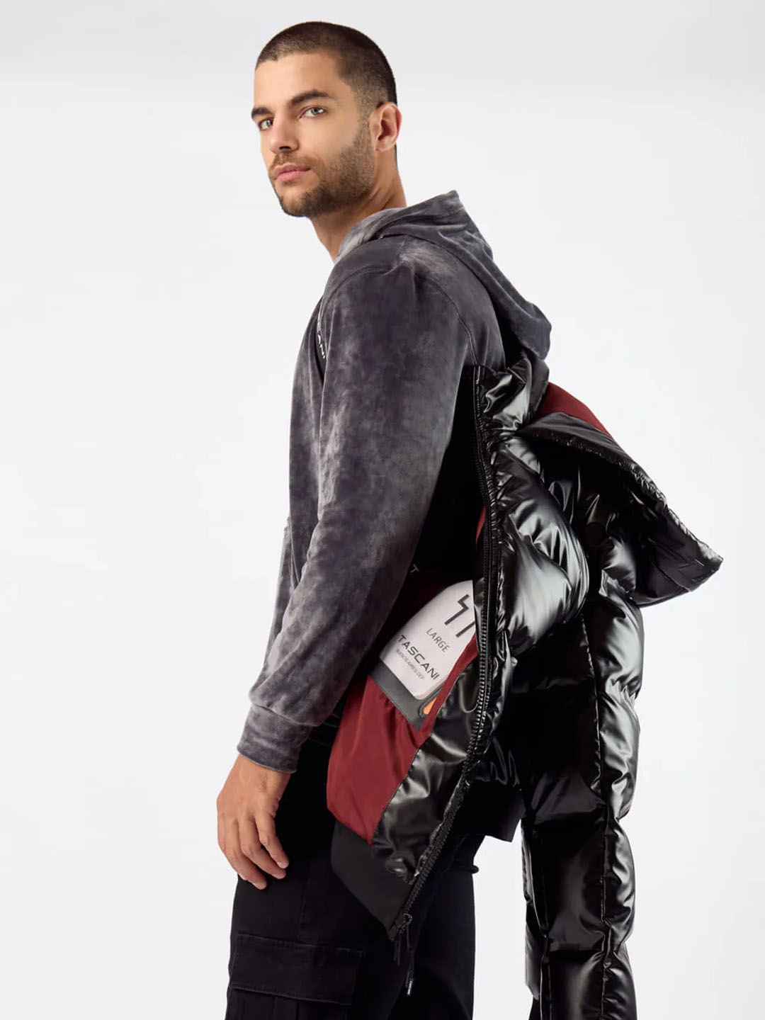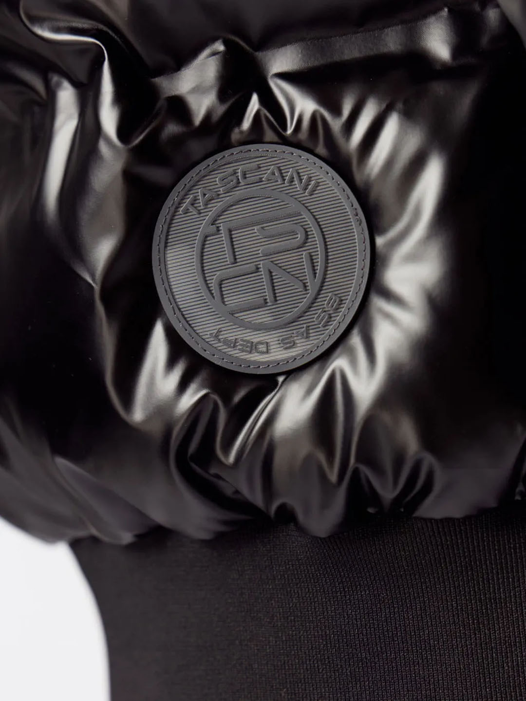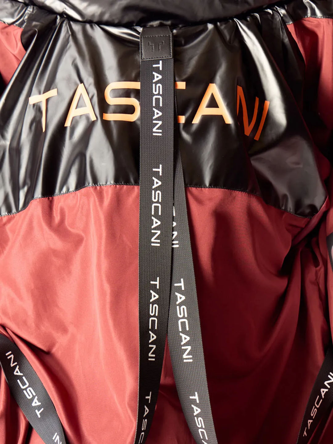 Cuenta cn capucha integrada con texto tascani estampado en goma siliconada brillante a tono.