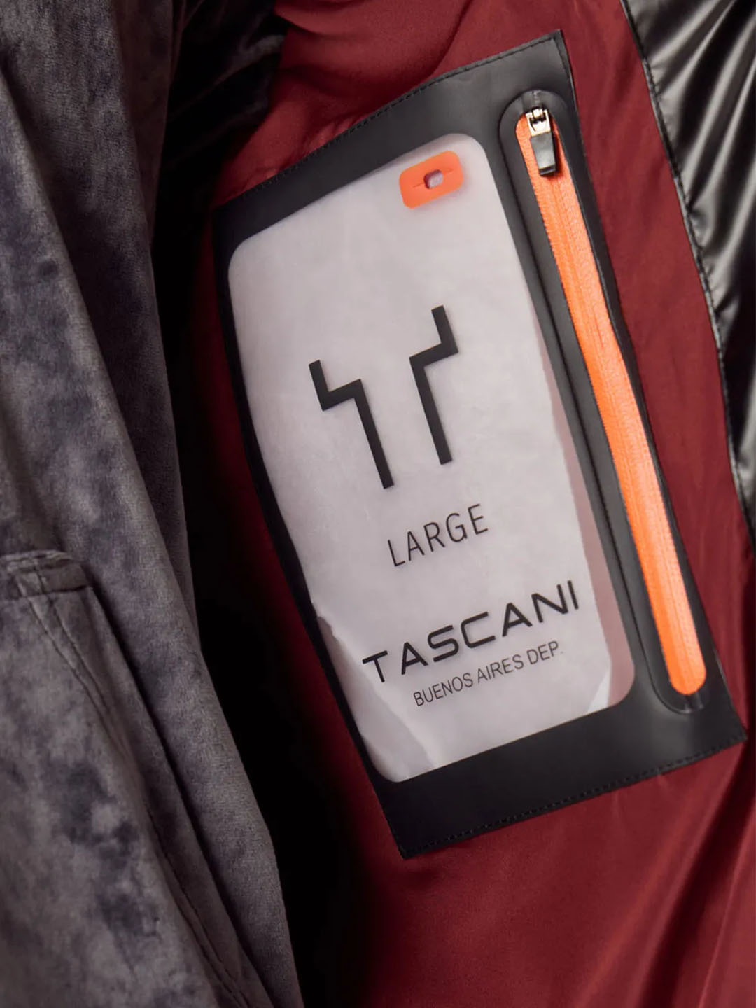 Interior en color contrastante con bolisllos y sistema interno de transporte con tiras tipo mochila (backpack straps), para uso cuando la prenda no está colocada.