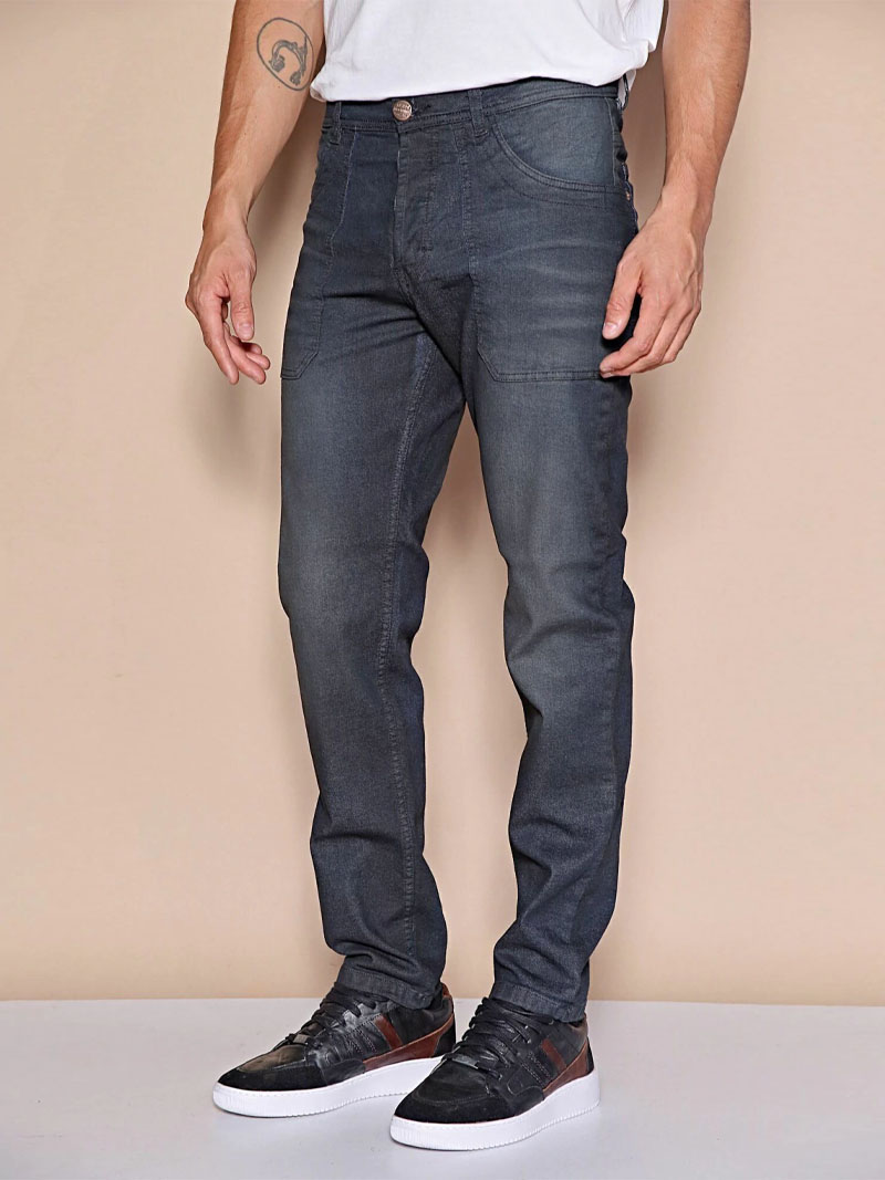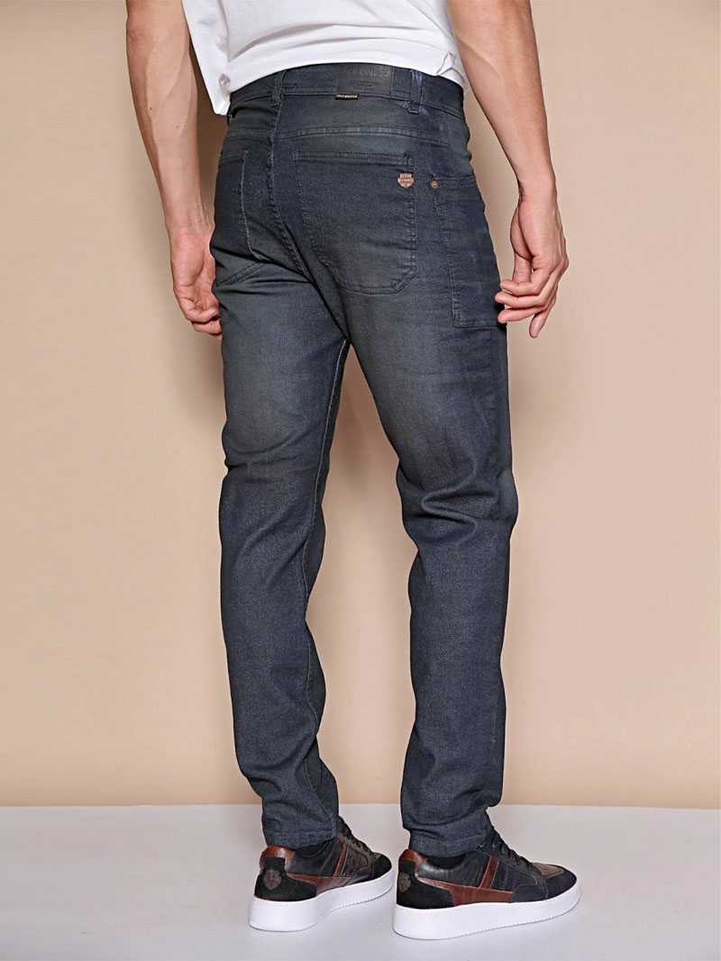 Denim de algodón con elastano. Lleva cartera con botones. Tiene bolsillos diferenciados aplicados. Lleva un lavado intenso de color negro con bigotes en caja. Se recomienda lavar del revés.