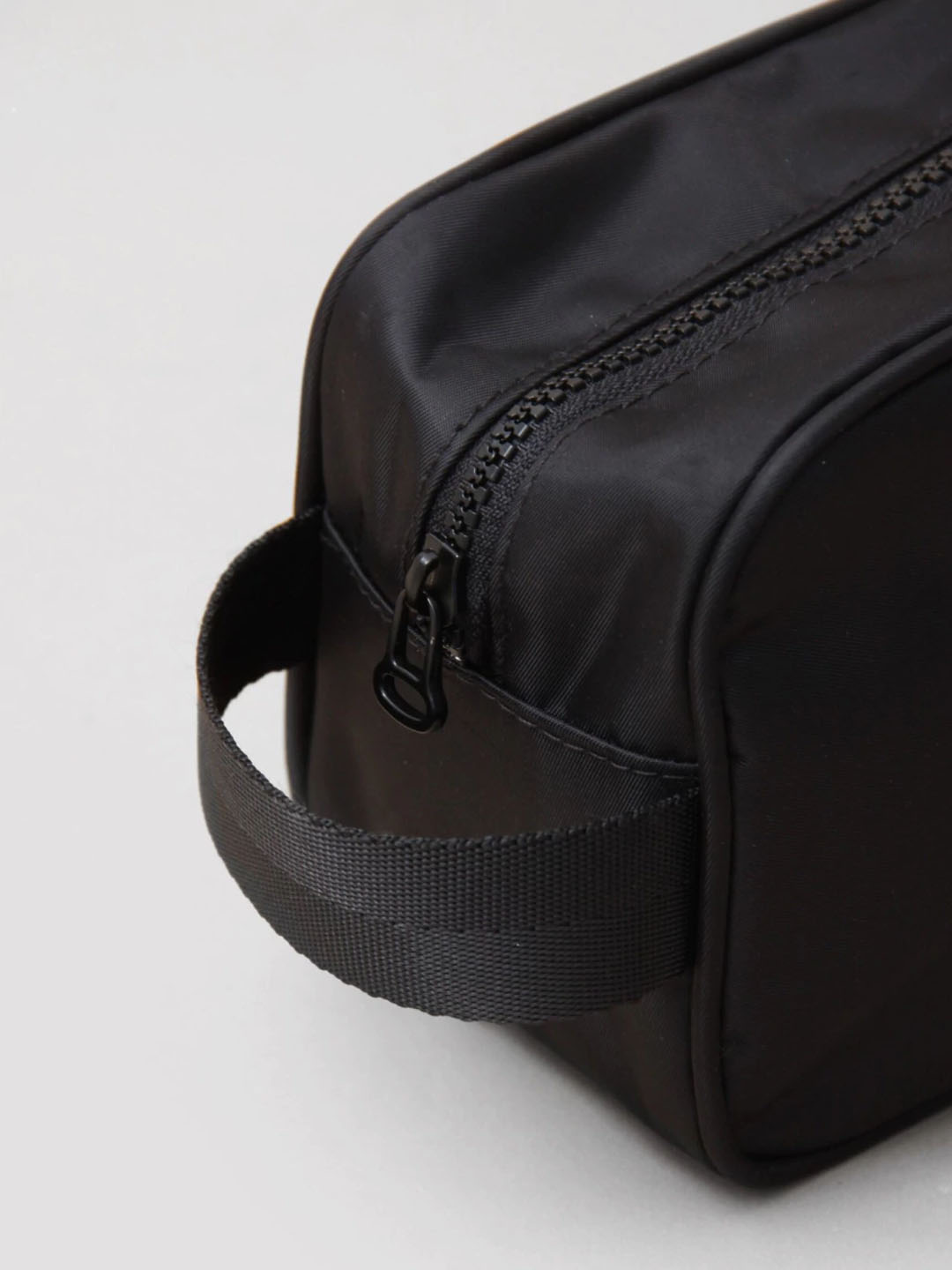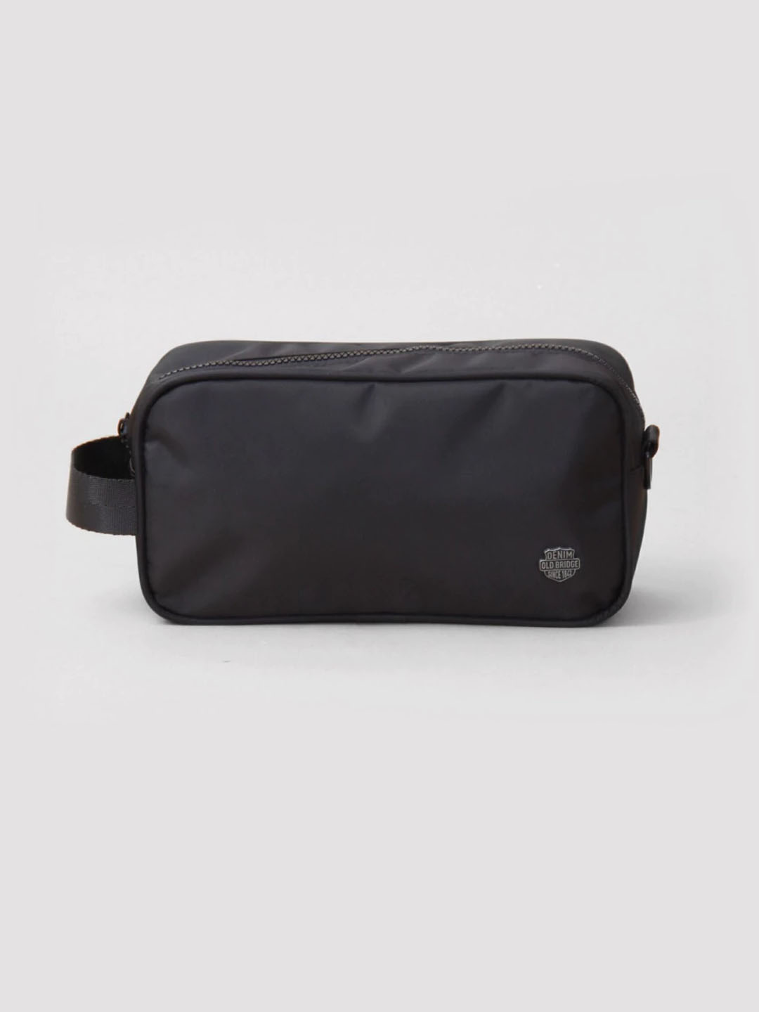 Neceser de tela impermeable con acceso a través de cierre dientes de perro negro. Posee una manija en uno de sus extremos, detalle de remache marcario en el frente.