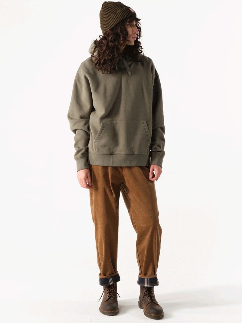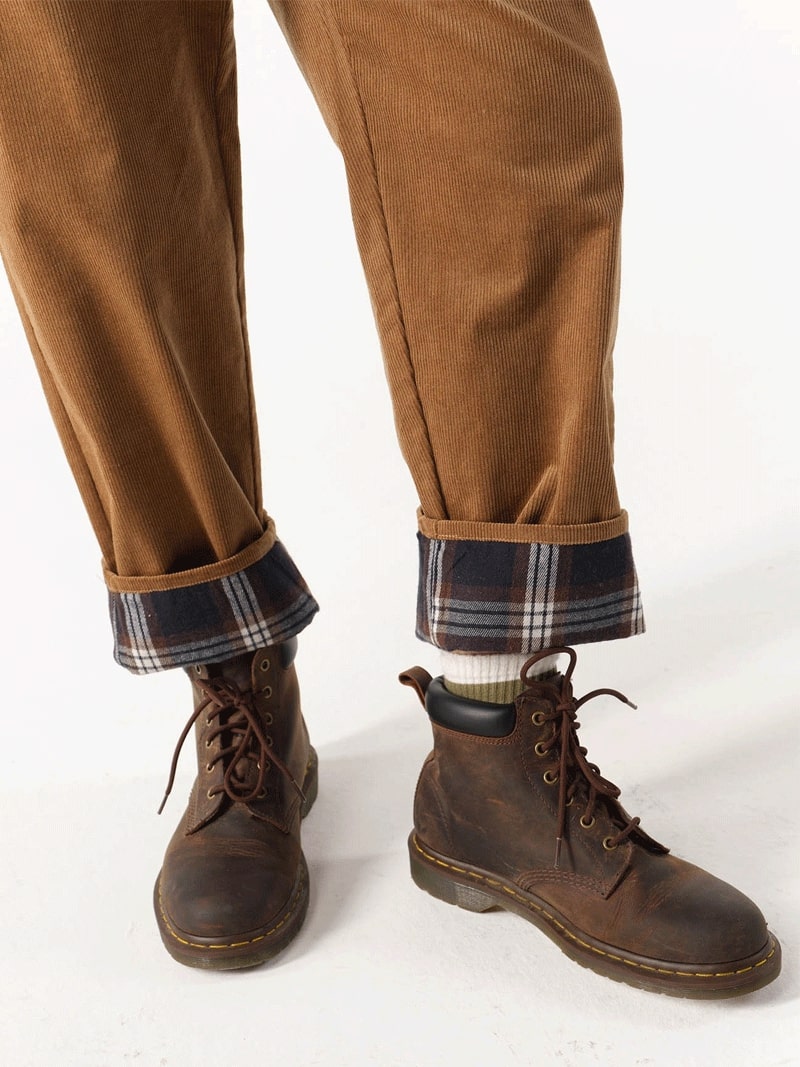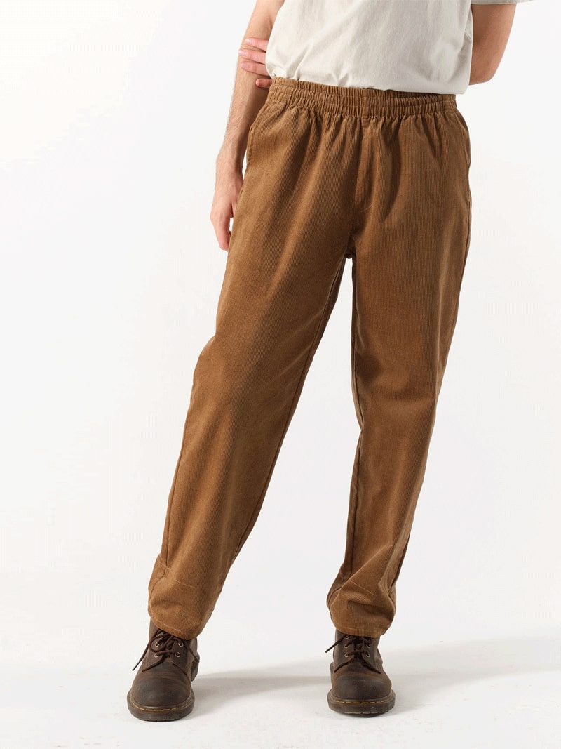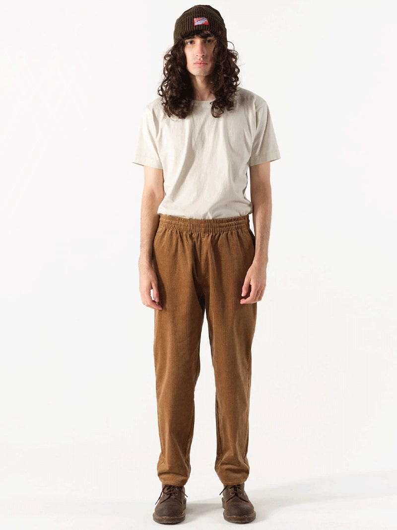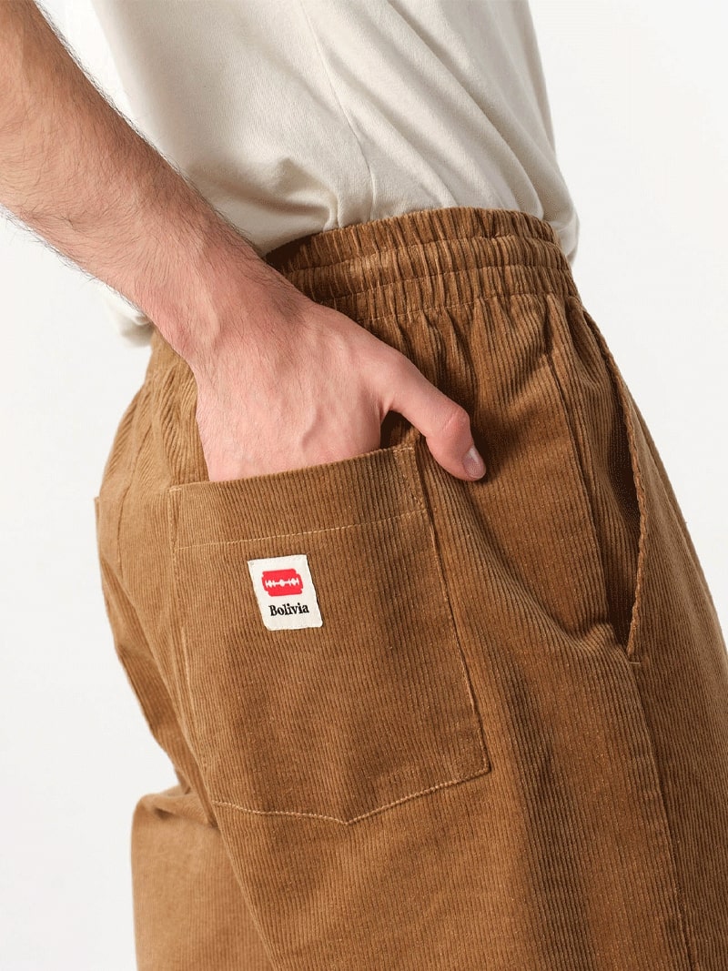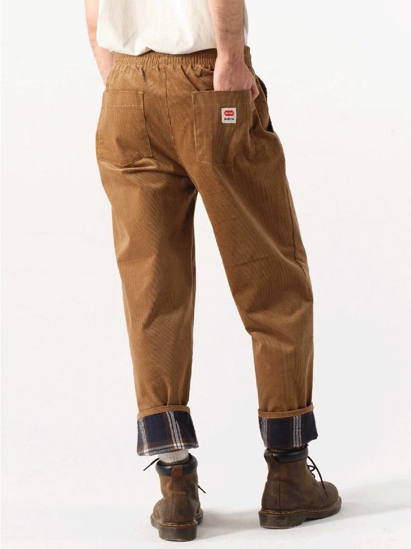 pantalón con elastico en cintura de corderoy . Calce recto con botamanga que se dobla en viyela