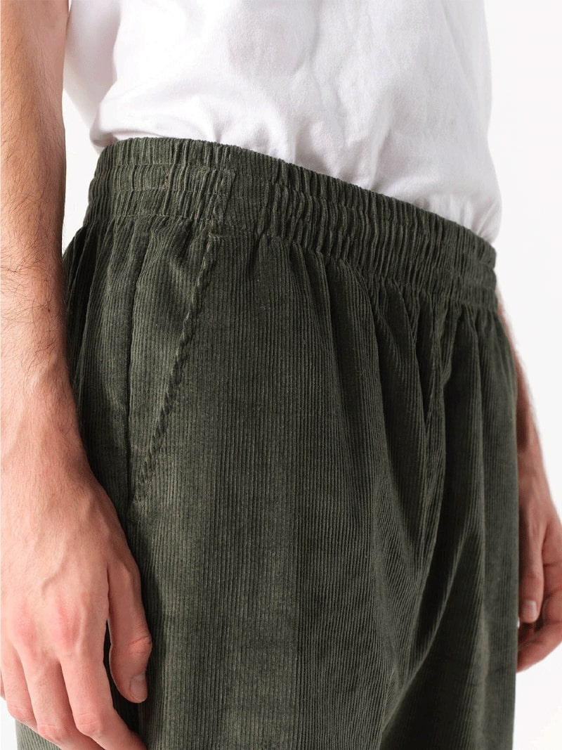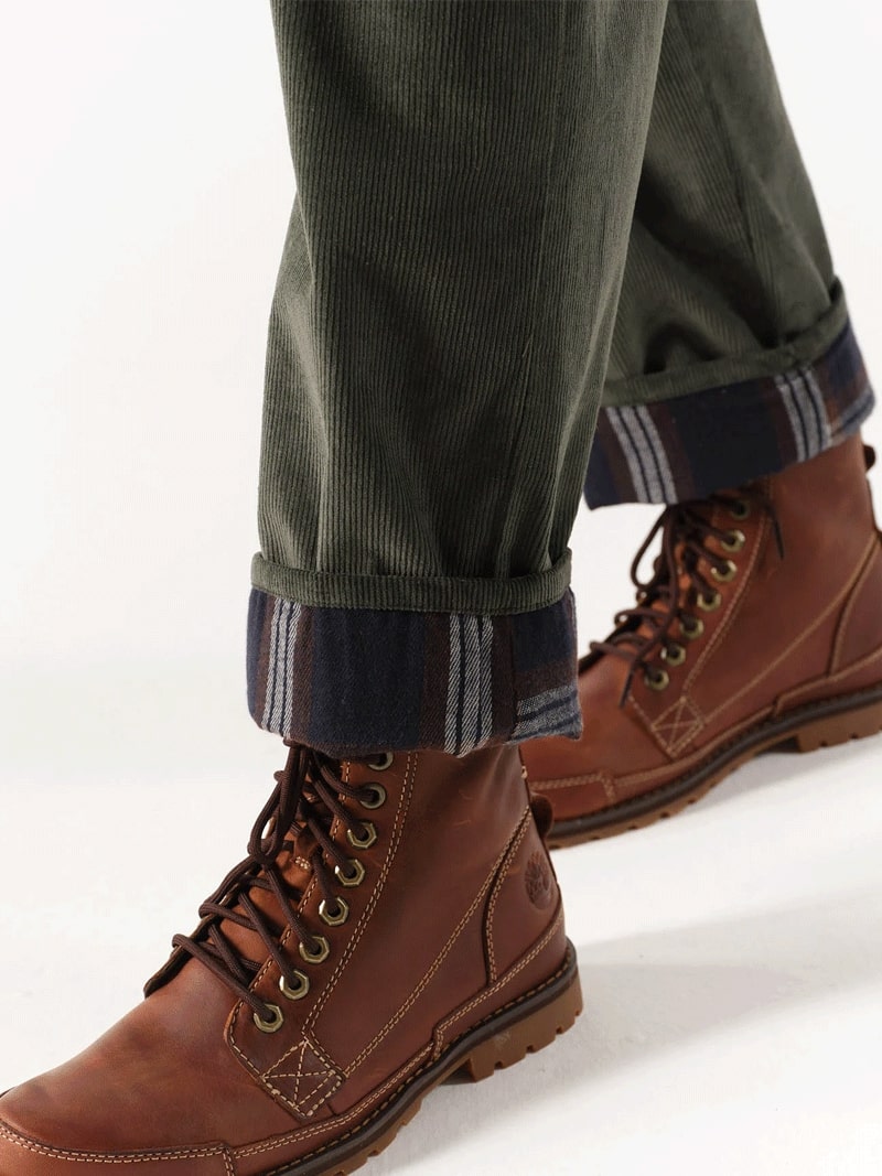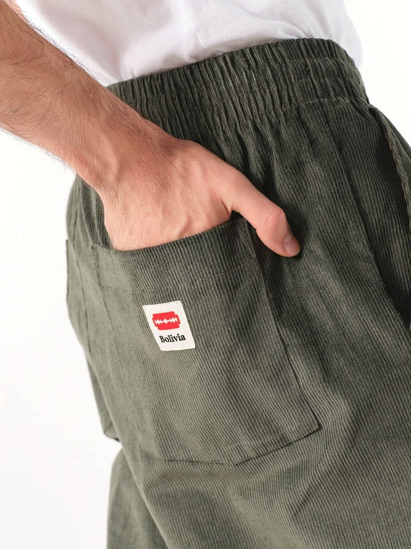 pantalón con elastico en cintura de corderoy . Calce recto con botamanga que se dobla en viyela