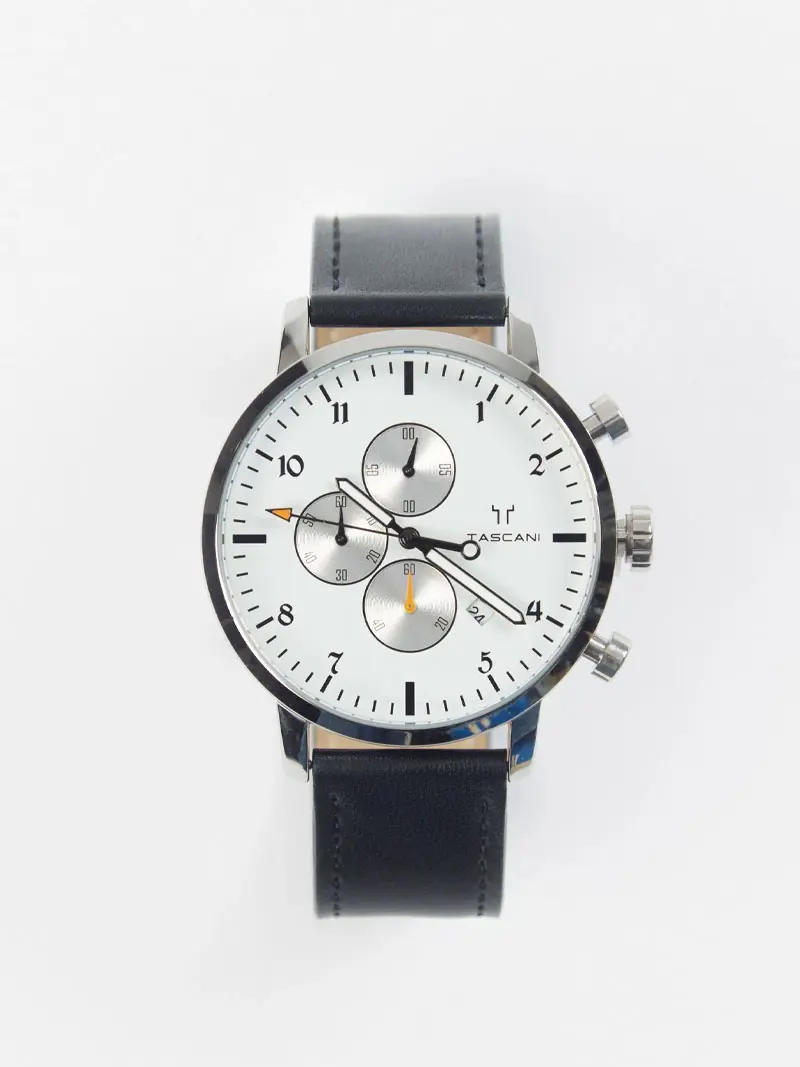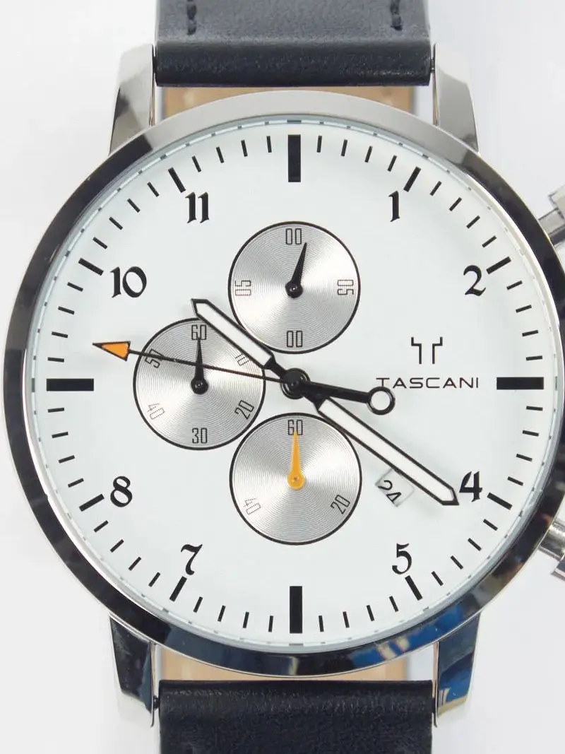 Reloj de caja de metal con maquinaria Japonesa MIYOTA 8215. Cuadrante con esferas y texto Tascani de fondo blanco. Malla de ecocuero negra. No es sumergible.
