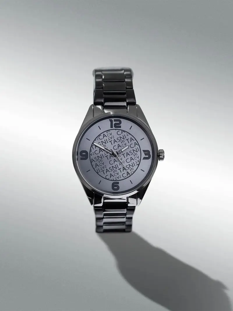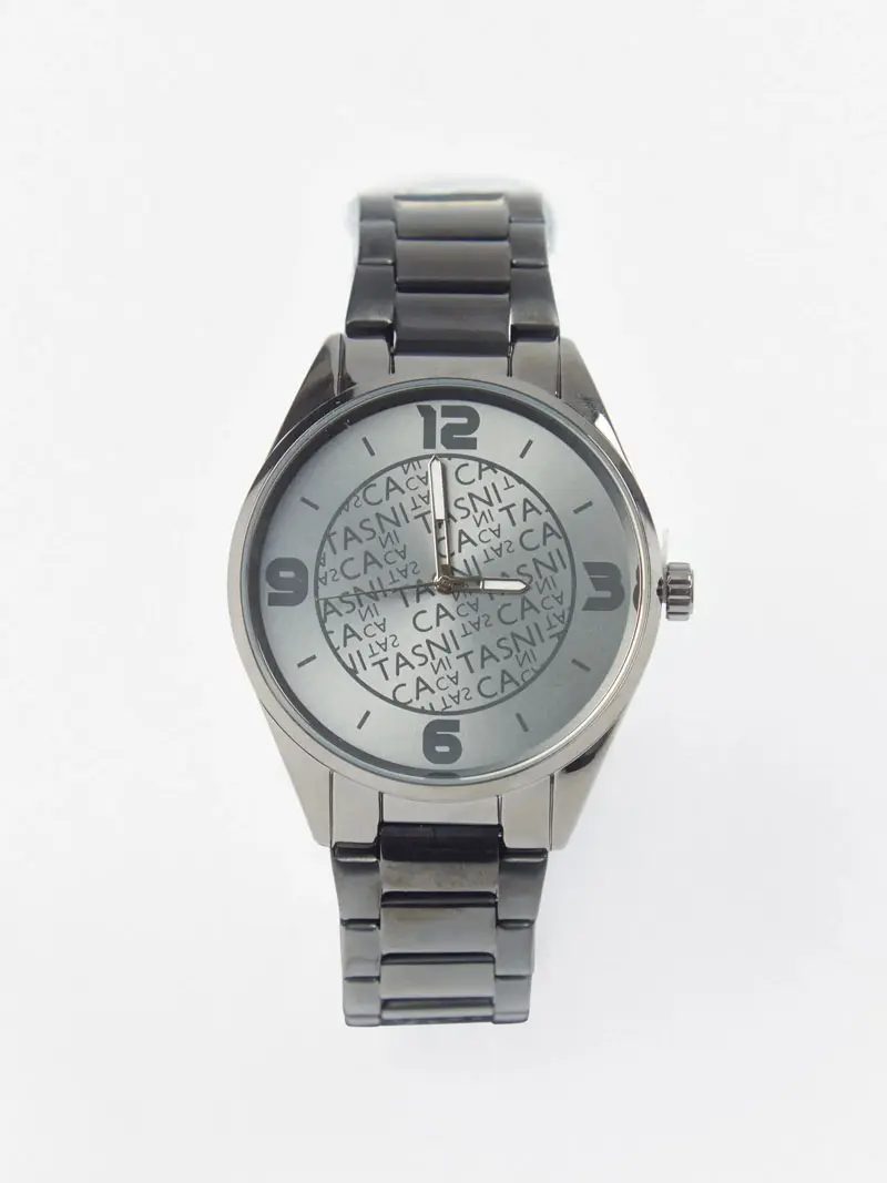 Reloj de caja de metal con maquinaria Japonesa MIYOTA 8215. Cuadrante con textos TASCANIS en centro en fondo acero. Malla metálica de acero inoxidable. No es sumergible.