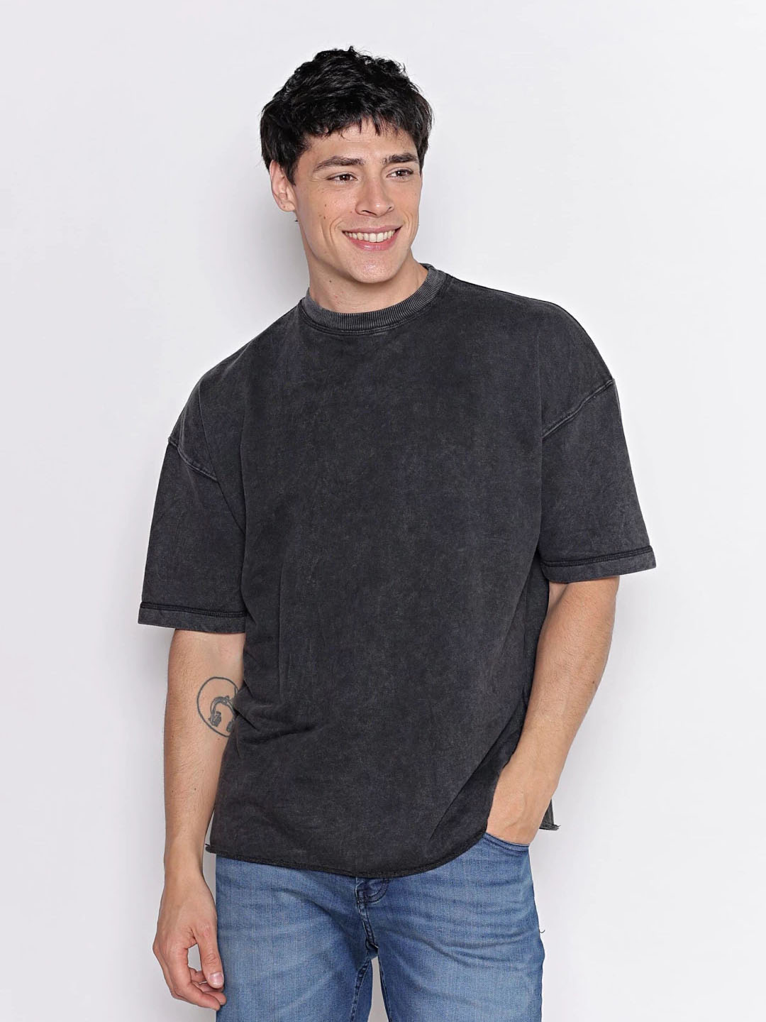 Remera oversize escote redondo, de mangas cortas, con cuello ribb al tono. Se encuentra confeccionada en rústico liviano de puro algodón, y lleva un proceso artesanal gastado. Su calce es holgado.