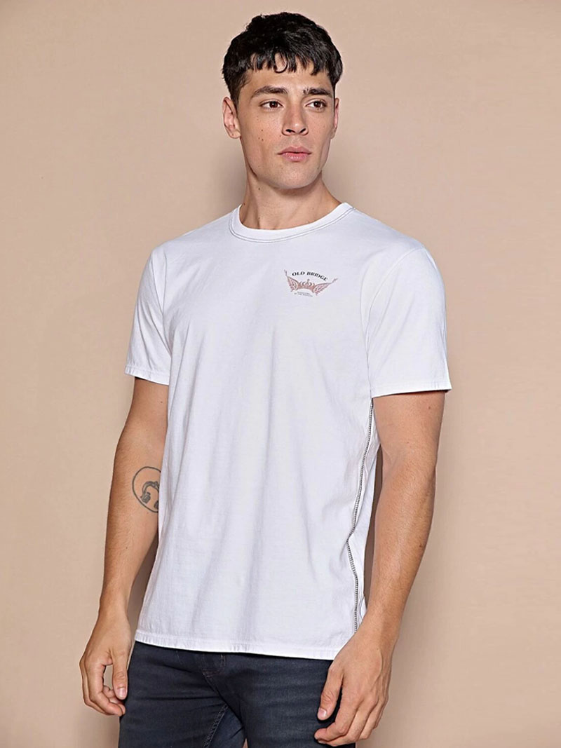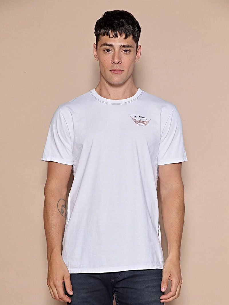 Remera estampada escote redondo, mangas cortas, con cuello en ribb al tono. Detalles de bordador a contracolor en laterales, y costuras en cuello a contracolor. Confeccionada en jersey puro algodón. Lleva al frente y espalda una estampa con tacto. Calce regular.