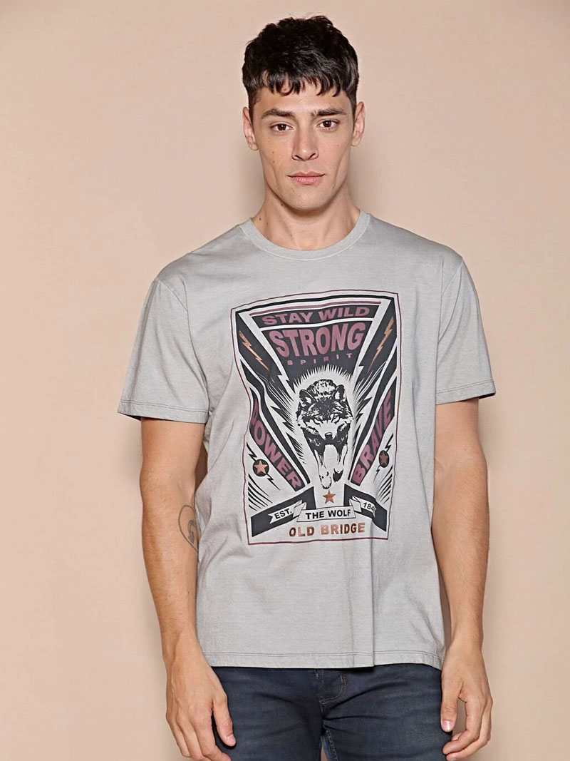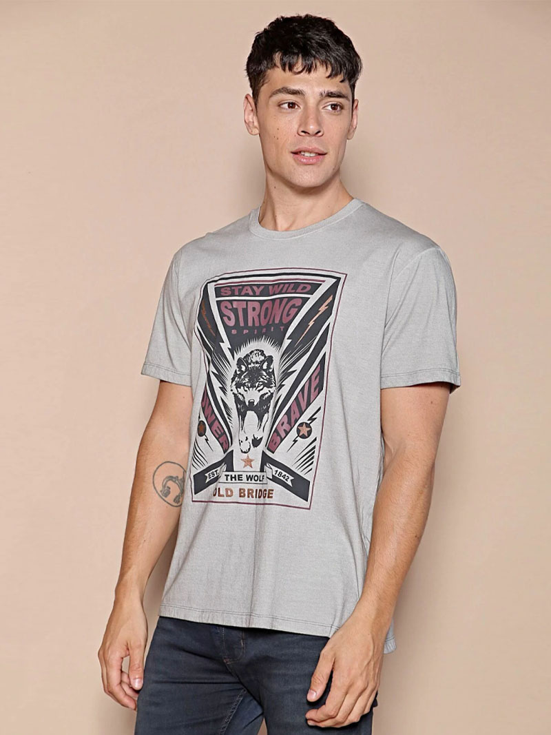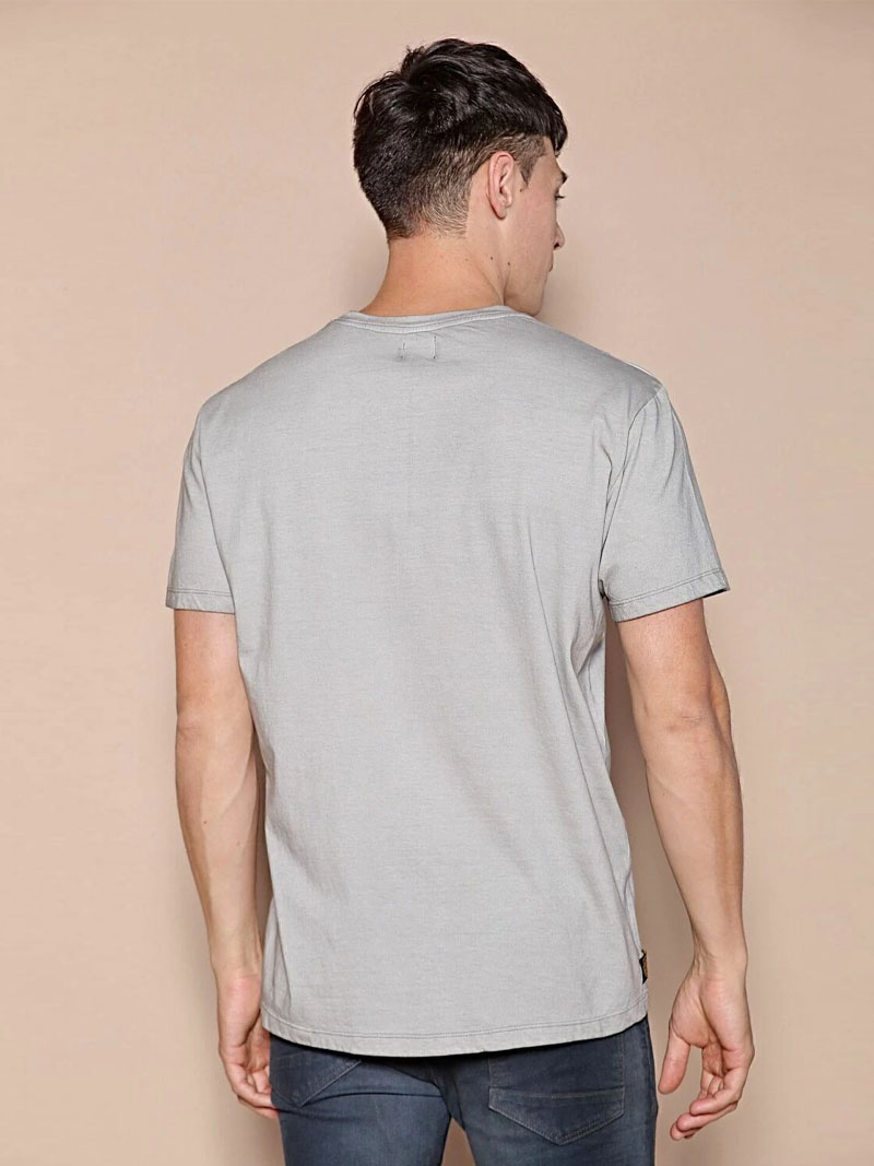 Remera estampada escote redondo, mangas cortas, con cuello ribb al tono. Confeccionada en jersey puro algodón, cuenta con un proceso de teñido irregular artesanal. En el frente lleva una estampa central con tacto. Calce regular.