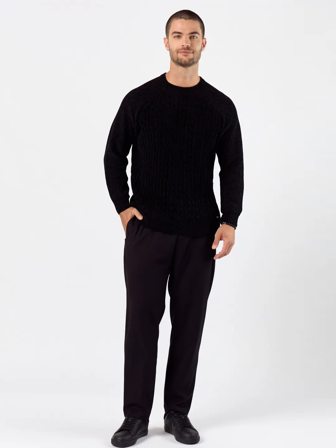 Sweater premium importado con hilado de tacto soft de chenille, manga larga. hilado con estructura y cambio de punto en la parte delantera y trasera. acabados en rib. chapita de comunicación cosida en delantero.